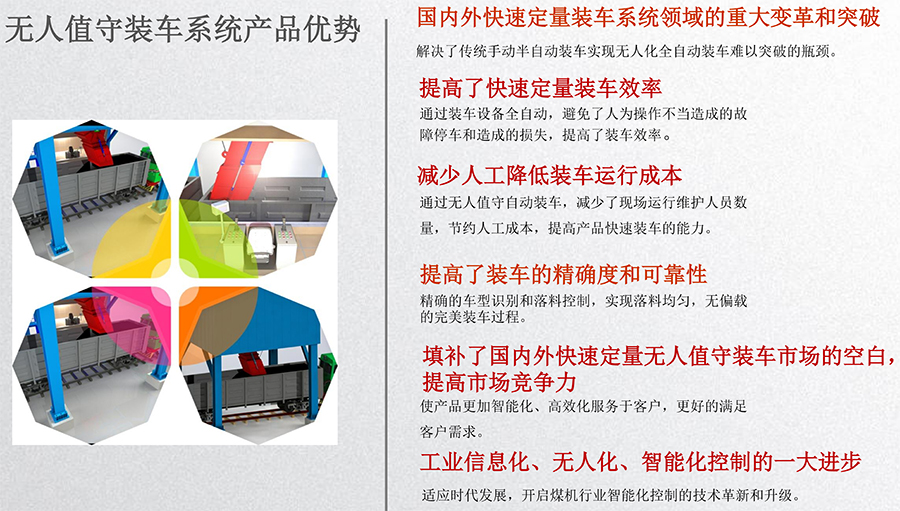 全(quán)自動裝(zhuāng)車及無(wú)人值守(shǒu)裝車系(xì)統是在(zài)現有自(zì)動化定(dìng)量裝車(chē)系統基(ji)礎上對(duì)信号檢(jiǎn)測和數(shu)據處理(lǐ)進行進(jìn)一步的(de)技術優(yōu)化和技(jì)術創新(xin),以實現(xian)裝車現(xian)場的無(wú)人值守(shǒu)自動裝(zhuāng)車控制(zhi),系統可(ke)根據對(duì)現場裝(zhuāng)車條件(jiàn)的預判(pàn)實現自(zi)動啓停(tíng)裝車系(xi)統,并擁(yōng)有強大(dà)的數據(jù)處理服(fu)務器可(kě)實現對(dui)裝車站(zhàn)内各個(ge)關鍵點(dian)的自動(dòng)檢測與(yǔ)數據處(chu)理,實現(xian)裝車站(zhan)的自控(kong)制、自學(xue)習,無人(ren)幹預的(de)自動完(wan)成快速(sù)定量裝(zhuang)車工作(zuò)。